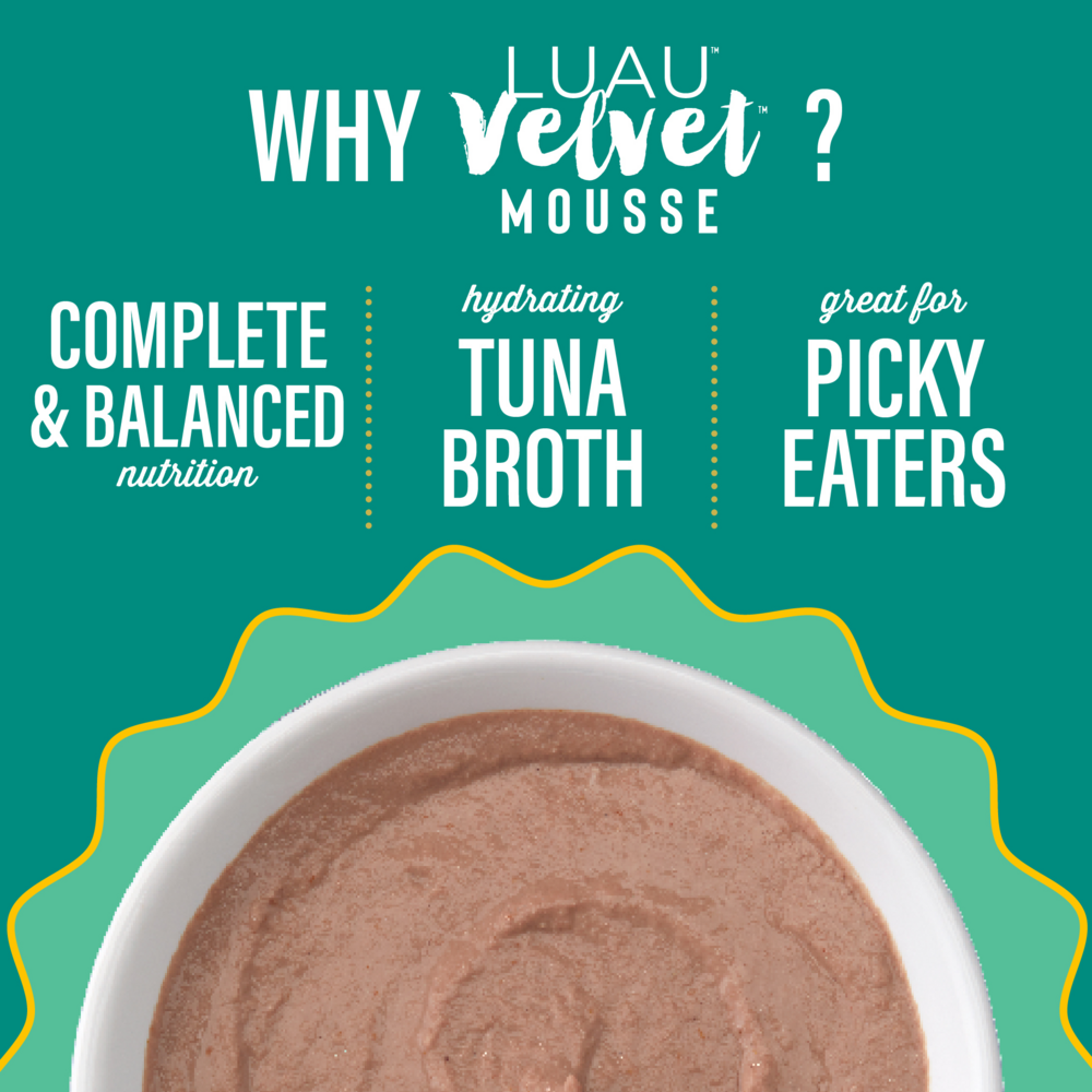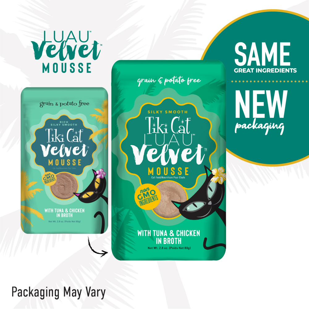 Tiki Cat Velvet Wet Cat Food features silkysmooth mouse blends of fish or chicken for the most finicky felines. GRAIN FREE NUTRITION – Made with real Tuna, Tiki Cat Velvet Mousse offers delicious nutrition. NUTRIENT RICH CAT FOOD - Real meat is the first ingredient, giving your cat the nutrition, she needs and the taste she loves. HIGH MOISTURE WET CAT FOOD – Count on the high moisture content of Tiki Cat Velvet Mouse to give your cat the supplemental water she needs