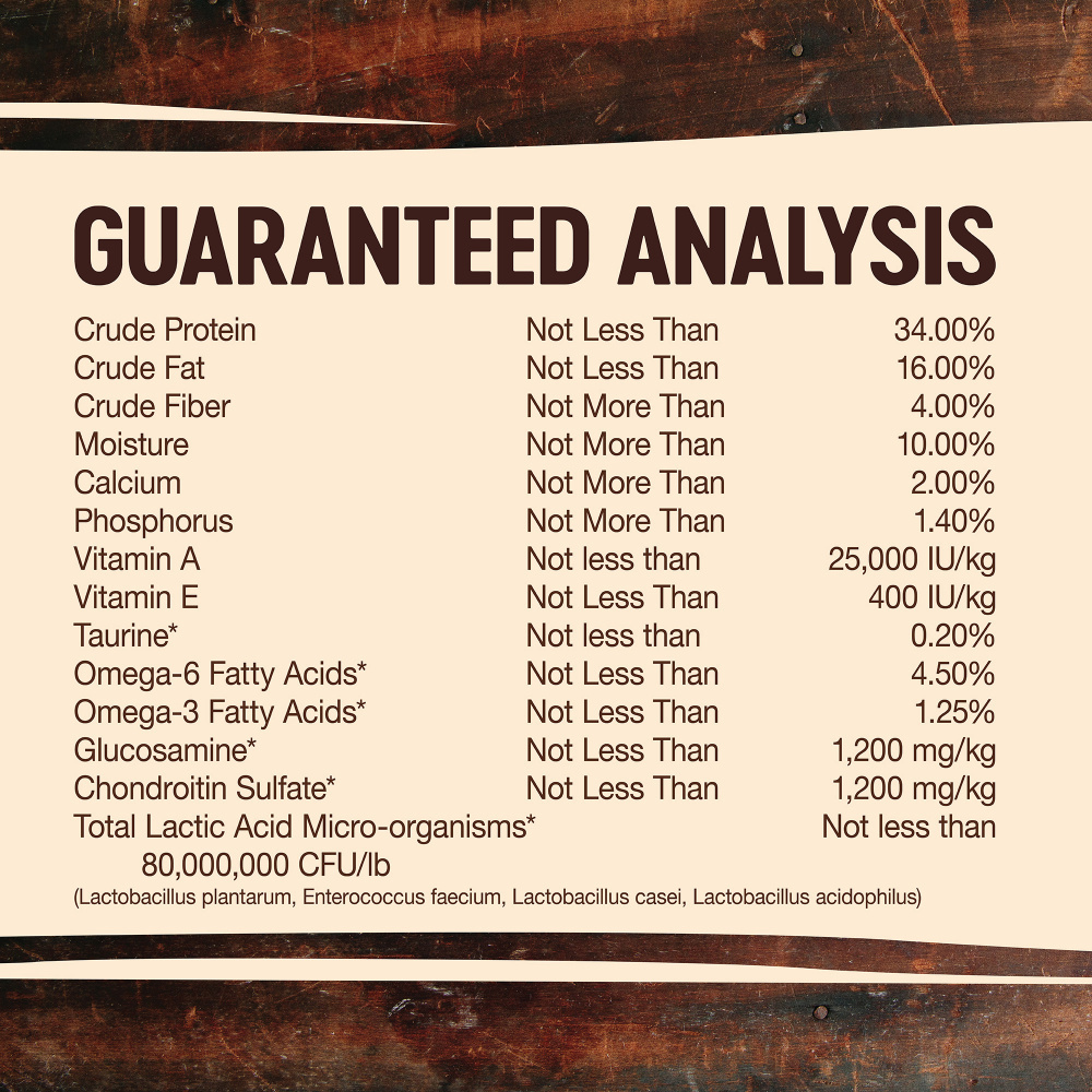 Deboned Turkey, Turkey Meal, Chicken Meal, Peas, Potatoes, Dried Ground Potatoes, Chicken Fat (preserved with Mixed Tocopherols), Tomato Pomace, Chicken Liver, Natural Chicken Flavor, Ground Flaxseed, Salmon Oil, Spinach, Vitamin E Supplement, Broccoli, Carrots, Choline Chloride, Parsley, Apples, Blueberries, Kale, Sweet Potatoes, Taurine, Mixed Tocopherols added to preserve freshness, Zinc Proteinate, Zinc Sulfate, Glucosamine Hydrochloride, Chondroitin Sulfate, Calcium Carbonate, Niacin, Ferrous Sulfate, Iron Proteinate, Beta-Carotene, Vitamin A Supplement, Copper Sulfate, Thiamine Mononitrate, Copper Proteinate, Manganese Proteinate, Manganese Sulfate, d-Calcium Pantothenate, Sodium Selenite, Pyridoxine Hydrochloride, Riboflavin, Chicory Root Extract, Yucca Schidigera Extract, Vitamin D3 Supplement, Biotin, Calcium Iodate, Vitamin B12 Supplement, Folic Acid, Ascorbic Acid (Vitamin C), Dried Lactobacillus plantarum Fermentation Product, Dried Enterococcus faecium Fermentation Product, Dried Lactobacillus casei Fermentation Product, Dried Lactobacillus acidophilus Fermentation Product, Rosemary Extract, Green Tea Extract, Spearmint Extract.This is a naturally preserved product.
