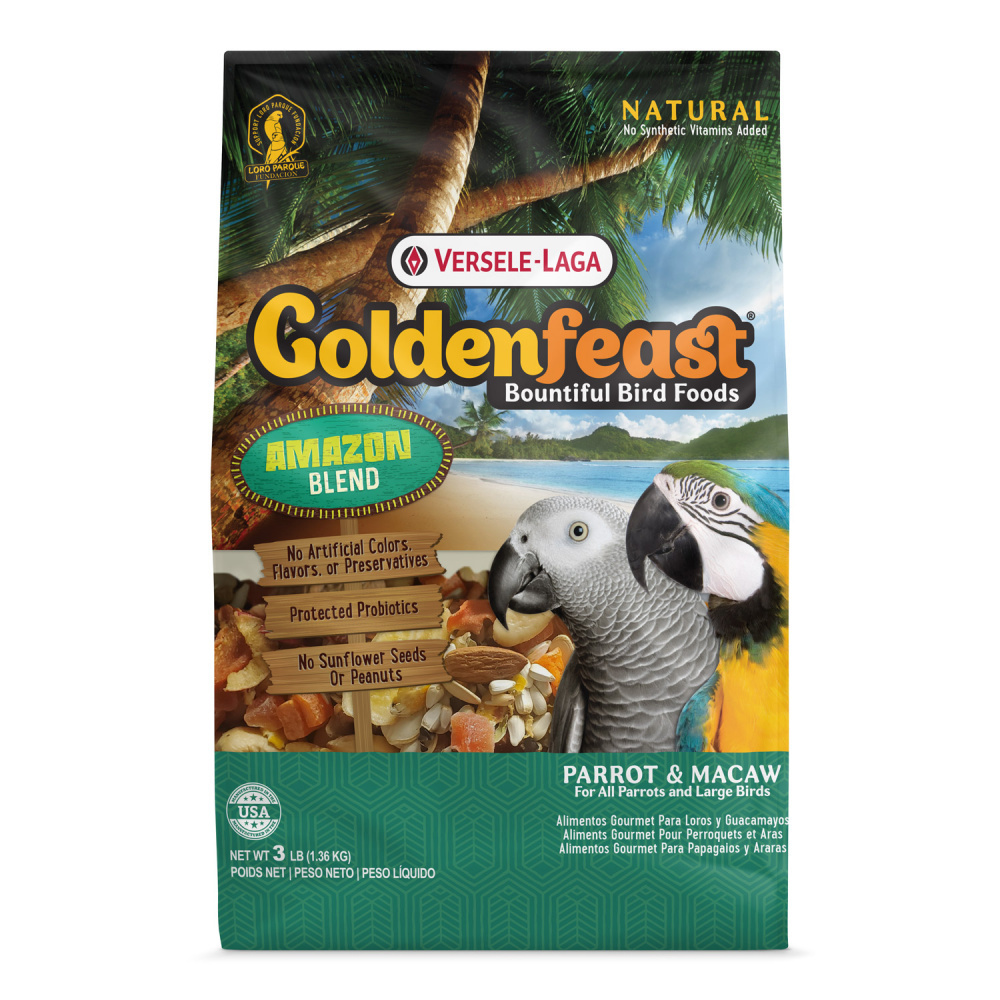 Goldenfeast delivers a natural bounty of dried fruits, vegetables, assorted nuts, legumes, seeds, and grains from all over the world. Your bird will enjoy foraging through the best nature has to offer. Just like in nature, our diets are free of artificial colors, preservatives and flavors and do not contain synthetic vitamins. Protected probiotics are added to help support immunity and overall health. Amazon Blend is inspired by the Brazilian rainforest and has a bounty of over 25 premium ingredients including pumpkin seeds, pineapple, mango, and Brazil nuts.Escape bird food boredom with Goldenfeast!