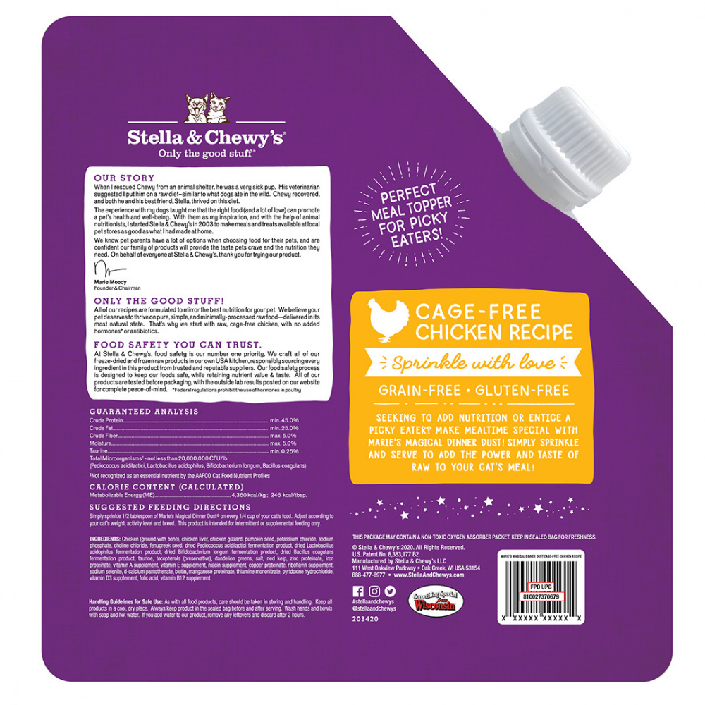 For pet parents seeking to add nutrition or entice a picky eater. Make mealtime special with Stella & Chewy's Marie's Magical Dinner Dust Cat Food Topper. Simply sprinkle and serve to add the power and taste of raw to your cat's meal.