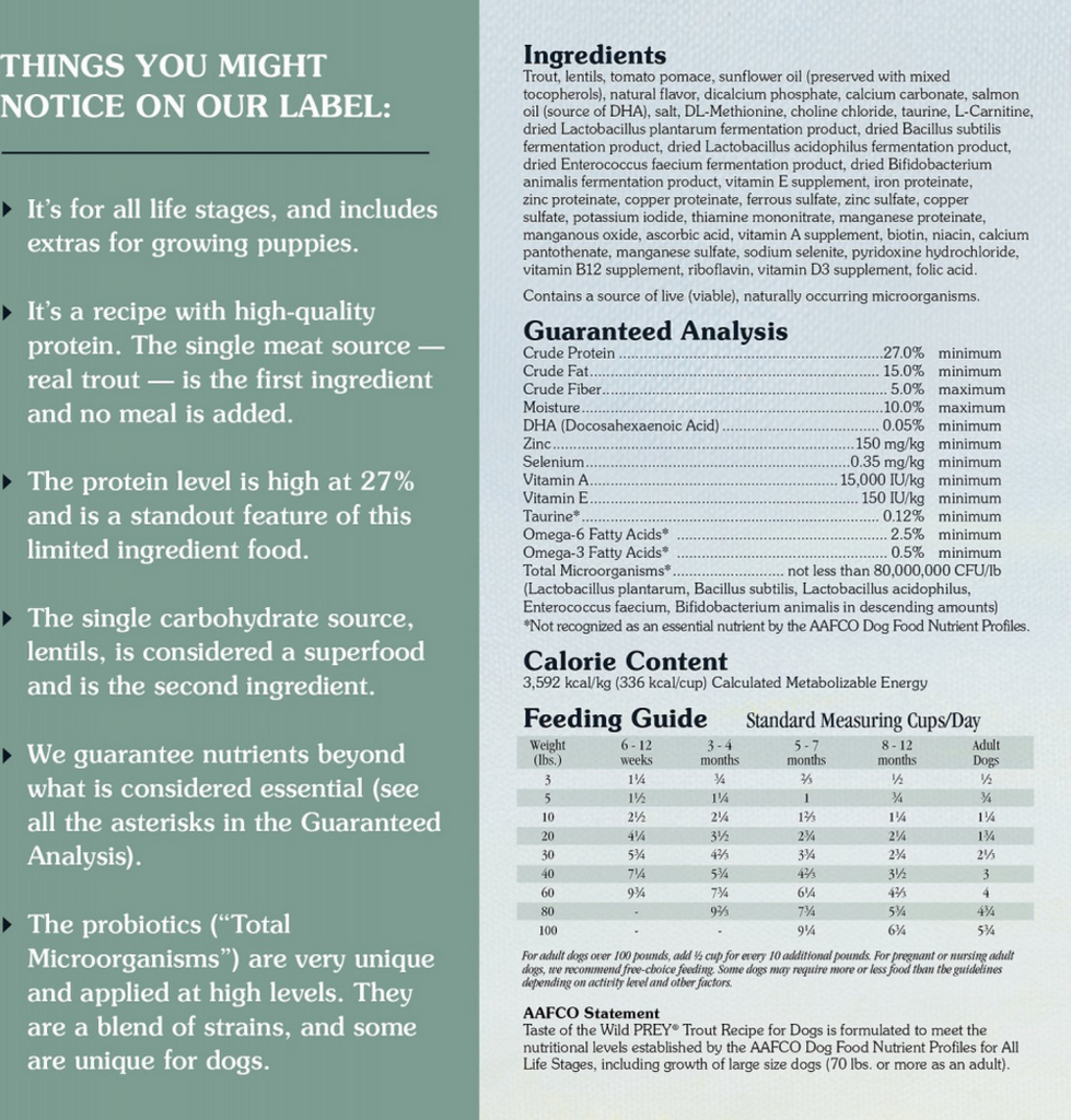 Trout, lentils, tomato pomace, chicken fat (preserved with mixed tocopherols), natural flavor, dicalcium phosphate, calcium carbonate, salmon oil (source of DHA), salt, DL-Methionine, choline chloride, taurine, L-Carnitine, dried Lactobacillus plantarum fermentation product, dried Bacillus subtilis fermentation product, dried Lactobacillus acidophilus fermentation product, dried Enterococcus faecium fermentation product, dried Bifidobacterium animalis fermentation product, vitamin E supplement, iron proteinate, zinc proteinate, copper proteinate, ferrous sulfate, zinc sulfate, manganese sulfate, copper sulfate, potassium iodide, thiamine mononitrate, manganese proteinate, ascorbic acid, vitamin A supplement, biotin, niacin, calcium pantothenate, sodium selenite, pyridoxine hydrochloride, vitamin B12 supplement, riboflavin, vitamin D3 supplement, folic acid.Contains a source of live (viable), naturally occurring microorganisms.Guaranteed Analysis