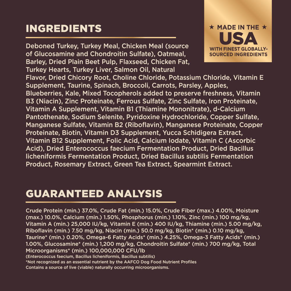 Deboned Turkey, Turkey Meal (source of Glucosamine), Chicken Meal (source of Chondroitin Sulfate), Barley, Oatmeal, Turkey Liver, Ground Flaxseed, Quinoa, Tomato Pomace, Chicken Fat, Natural Turkey Flavor, Salmon Oil, Chicory Root Extract, Potassium Chloride, Choline Chloride, Vitamin E Supplement, Taurine, Spinach, Broccoli, Carrots, Parsley, Apples, Blueberries, Kale, Mixed Tocopherols added to preserve freshness, Zinc Proteinate, Zinc Sulfate, Calcium Carbonate, Niacin, Iron Proteinate, Ferrous Sulfate, Yucca Schidigera Extract, Vitamin A Supplement, Copper Sulfate, Thiamine Mononitrate, Copper Proteinate, Manganese Proteinate, Manganese Sulfate, d-Calcium Pantothenate, Sodium Selenite, Pyridoxine Hydrochloride, Riboflavin, Biotin, Vitamin D3 Supplement, Calcium Iodate, Vitamin B12 Supplement, Folic Acid, Ascorbic Acid (Vitamin C), Dried Lactobacillus plantarum Fermentation Product, Dried Enterococcus faecium Fermentation Product, Dried Lactobacillus casei Fermentation Product, Dried Lactobacillus acidophilus Fermentation Product, Rosemary Extract, Green Tea Extract, Spearmint Extract.Guaranteed Analysis