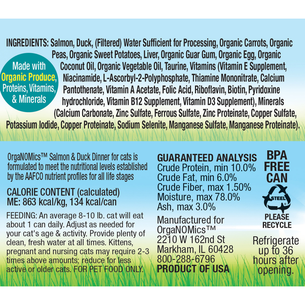 Salmon and delectable duck are served in a pate style with a side of organic produce to make up this clean and green NOM for finicky felines.