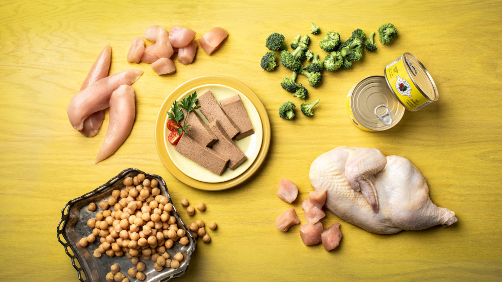 Chicken, Chicken Broth, Chicken Liver, Chickpeas, Broccoli, Tomato Paste, Salmon Oil (preserved with mixed tocopherols), Minerals [Dicalcium Phosphate, Zinc Sulfate, Magnesium Sulfate, Zinc Proteinate, Ferrous Sulfate], Calcium Carbonate, Minerals [Copper Sulfate, Ferrous Proteinate, Sodium Selenite, Calcium Iodate, Manganese Sulfate, Copper Proteinate, Manganese Proteinate], Xanthan Gum, Locust Bean Gum, Salt, Potassium Chloride, Taurine, Vitamins [Vitamin E Supplement, Niacin Supplement, Thiamine Mononitrate, Vitamin A Supplement, Calcium Pantothenate, Riboflavin Supplement, Pyridoxine Hydrochloride, Vitamin B12 Supplement, Vitamin D3 Supplement, Folic Acid, Choline Chloride]