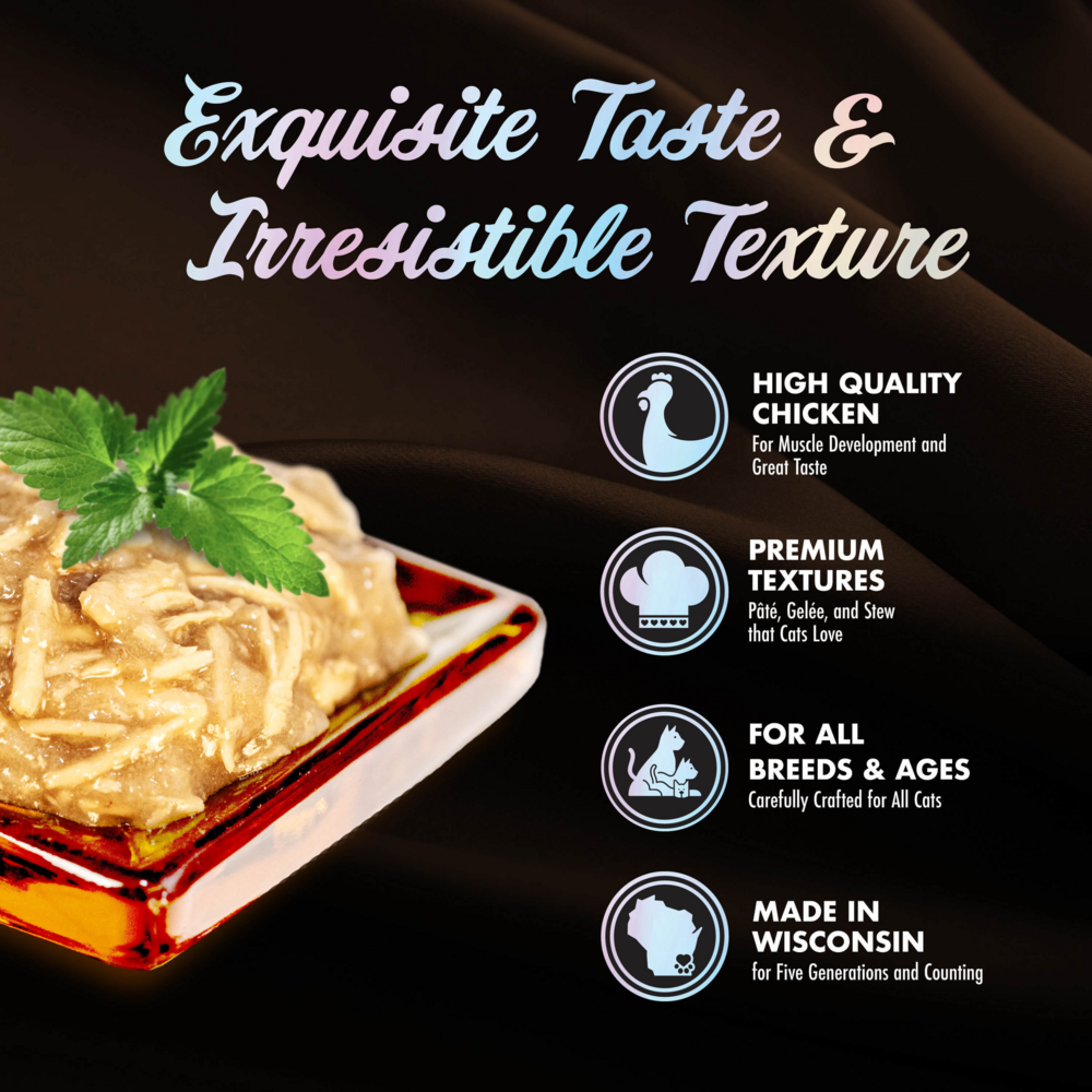 Fromm Family Recipes PurrSnickety™ Pâtés for Cats are family favorites made for the pickiest of cats. Made with finely minced, high-quality proteins and savory broth for an irresistible taste.Feeding InstructionsMany factors including age, breed, activity level, and individual metabolism contribute to the need for adjusting portion sizes. Two to four times more food may be required for kittens, gestating cats, and nursing cats. Kittens weighing less than four pounds and/or younger than six weeks should be fed free choice. Spayed or neutered cats may require up to 25% less food.Determining the correct amount of food for your pet depends upon your evaluation of your pet's overall performance on the amount of food consumed along with any other food or treats given.If feeding canned food only, the average cat requires 1 oz for each pound of body weight, best fed twice a day.