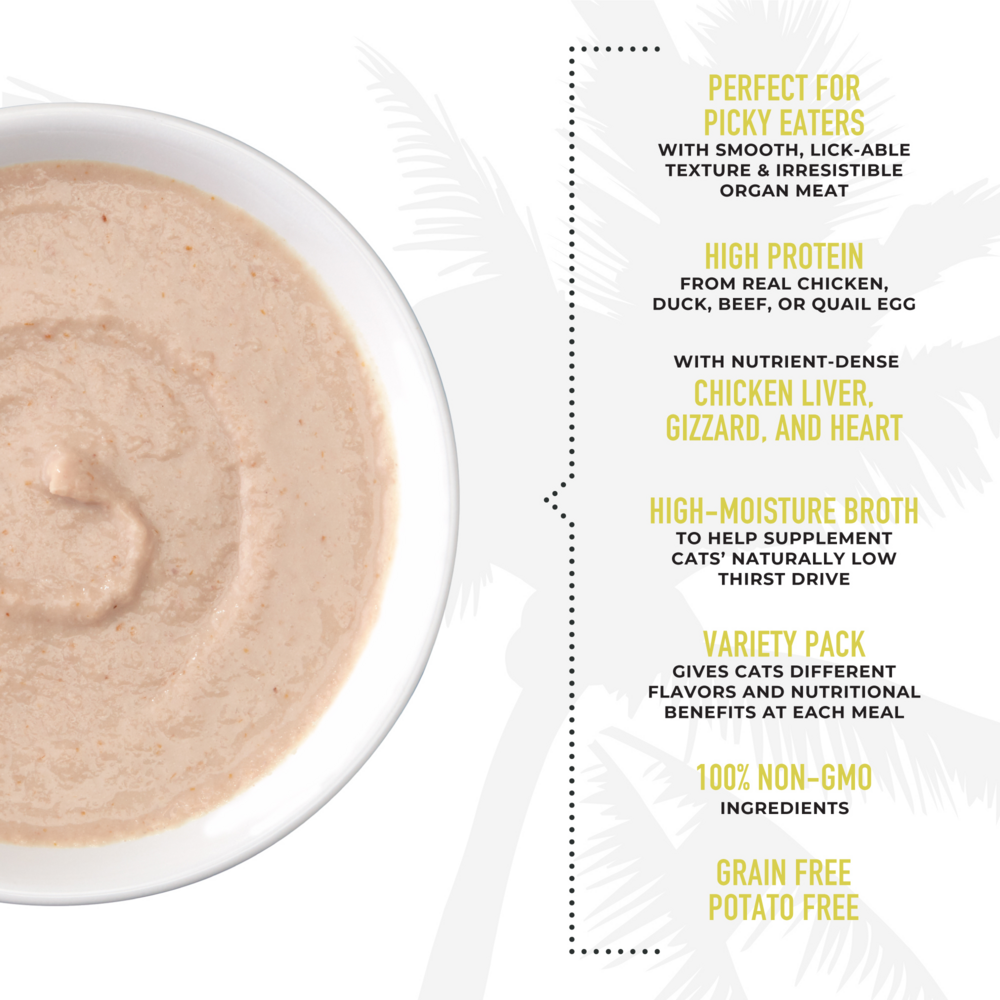 Grain-Free, High-Protein, Animal-Based wet cat food with tasty chunks of organ meatVariety Pack Contents: (2) 11250 2.8oz Chicken & Quail(2) 11251 2.8oz Chicken & Duck(2) 11252 2.8oz Chicken & Lamb(2) 11253 2.8oz Chicken & Beef(2) 11254 2.8oz Chicken & Pork(2) 11255 2.8oz Chicken