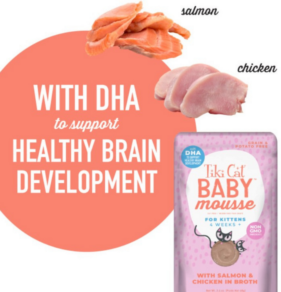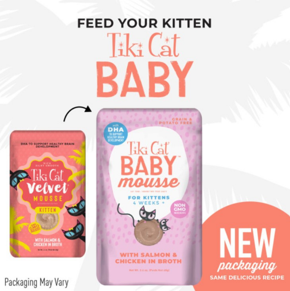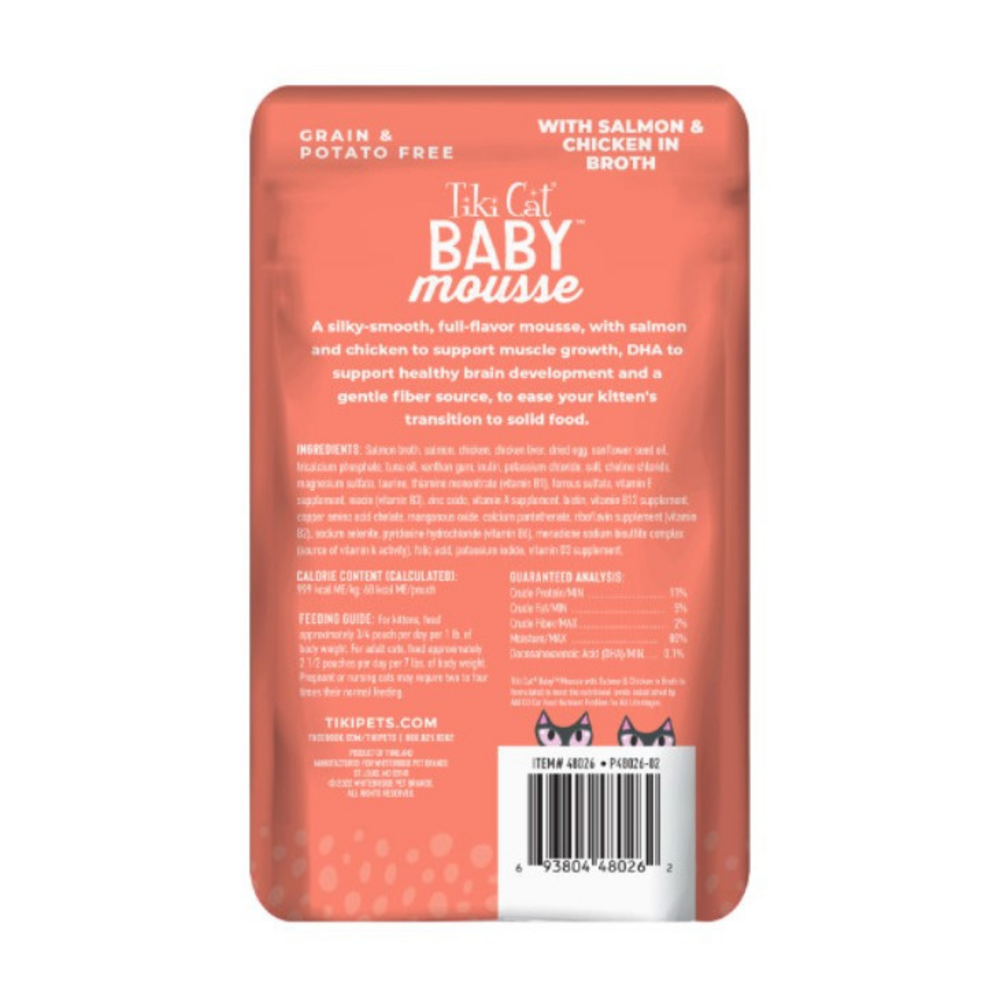 Tiki Cat Baby Mousse for Kittens is a silkysmooth fullflavor mousse made with salmon and chicken to support muscle growth. DHA supports healthy eye and brain development and a blend of gentle fiber sources helps to ease your kitten's transition to solid food. NUTRIENT RICH KITTEN FOOD - includes real salmon, chicken, and liver, giving your kitten the nutrition she needs and the taste she loves in easy to serve pouches. SPECIALLY FORMULATED FOR KITTENS – With smooth, easy texture, high quality proteins, and antioxidant nutrients, Tiki Cat Baby Mousse provides complete nutrition and delicious flavors for your growing kitten.