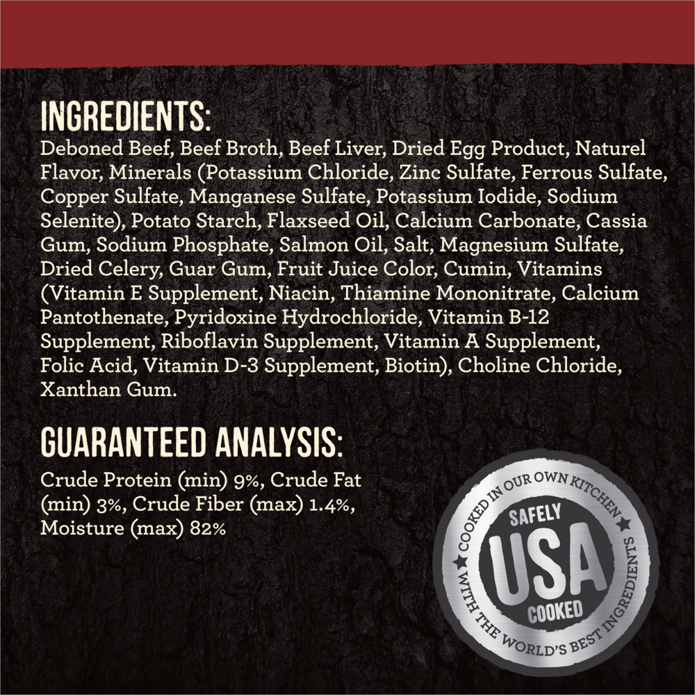 Deboned Beef, Beef Broth, Beef Liver, Dried Egg Product, Naturel Flavor, Minerals (Potassium Chloride, Zinc Sulfate, Ferrous Sulfate, Copper Sulfate, Manganese Sulfate, Potassium Iodide, Sodium Selenite), Potato Starch, Flaxseed Oil, Calcium Carbonate, Cassia Gum, Sodium Phosphate, Salmon Oil, Salt, Magnesium Sulfate, Dried Celery, Guar Gum, Fruit Juice Color, Cumin, Vitamins (Vitamin E Supplement, Niacin, Thiamine Mononitrate, Calcium Pantothenate, Pyridoxine Hydrochloride, Vitamin B-12 Supplement, Riboflavin Supplement, Vitamin A Supplement, Folic Acid, Vitamin D-3 Supplement, Biotin), Choline Chloride, Xanthan GumGuaranteed Analysis