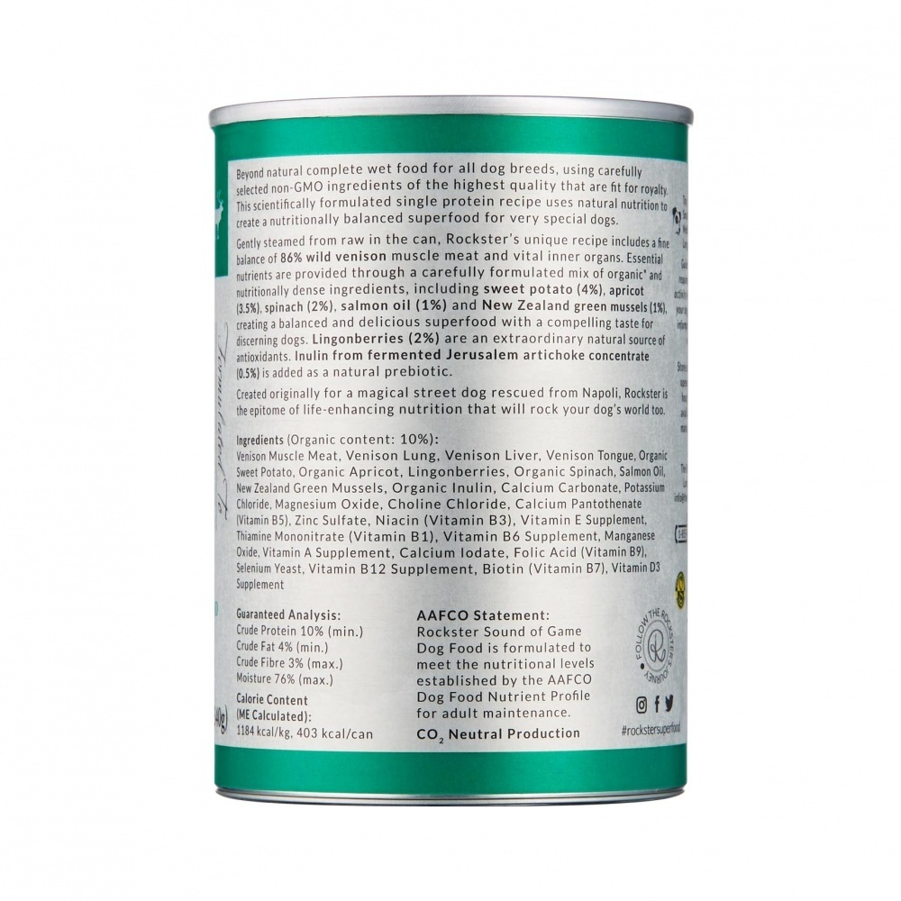 Beyond natural complete wet food for all dog breeds, using carefully selected human grade and non-GMO ingredients of the highest quality that are fit for royalty. This scientifically formulated single protein recipe uses natural nutrition to create a nutritionally balanced superfood for very special dogs.Gently steamed from raw in the can to preserve vital nutrients and vitamins, Rockster’s unique recipe includes a fine balance of 86% wild venison muscle meat and vital inner organs. Essential nutrients and antioxidants are provided through a carefully formulated mix of organic* and nutritionally dense ingredients, including sweet potato, apricot, and spinach, creating a balanced and delicious superfood with a compelling taste for discerning dogs. Salmon oil and New Zealand green mussels aid in this recipe‘s optimal Omega 6:3 ratio, assisting with anti-inflammatory activity. Lingonberries (2%) are an extraordinary natural source of antioxidants. The nutrients in this recipe aidmusculoskeletal, cellular, metabolic and immune support. As with all of our recipes, inulin from fermented Jerusalem artichoke concentrate is added as a natural prebiotic. Created originally for a magical street dog rescued from Napoli, Rockster is the epitome of life-enhancing nutrition that will rock your dog’s world too.Whilst we source the highest quality organic and non-GMO ingredients, Rockster is produced in a pet food facility and is for animal consumption only. Extensive measures have been put in place to ensure there is no risk of contact with feed grade ingredients.