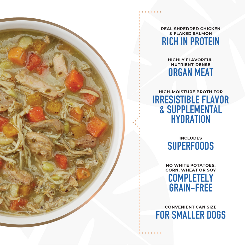 Tiki DogAloha Petites Wet Dog Food is hearty meals with tender shredded chicken flaked fish and nutritious vegetables in a savory broth. Pure bliss with every bite. REAL INGREDIENTS, REAL PROTEIN – high-quality chicken and wild-caught Alaskan salmon. CANNED DOG FOOD – Hand packed super foods like mung bean, sweet potato, carrots, pumpkin, kale, flaxseed, and turmeric powder.WET DOG FOOD – Complete and balanced for small, medium, and large dog breeds in all life stages.