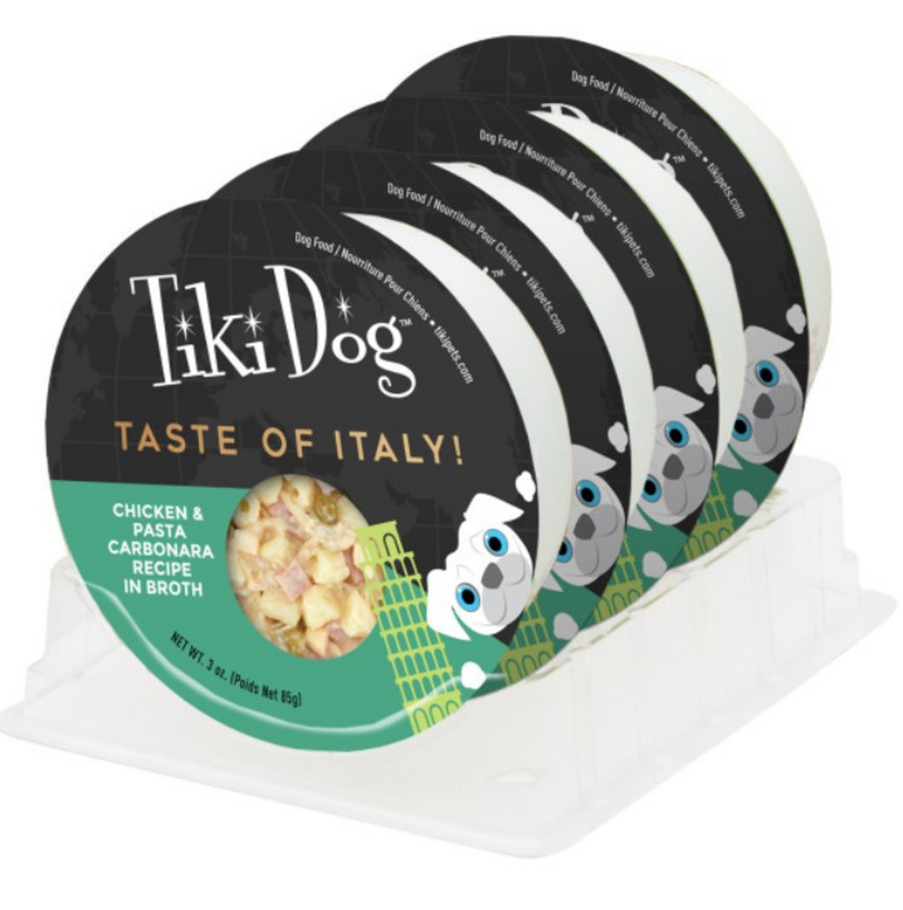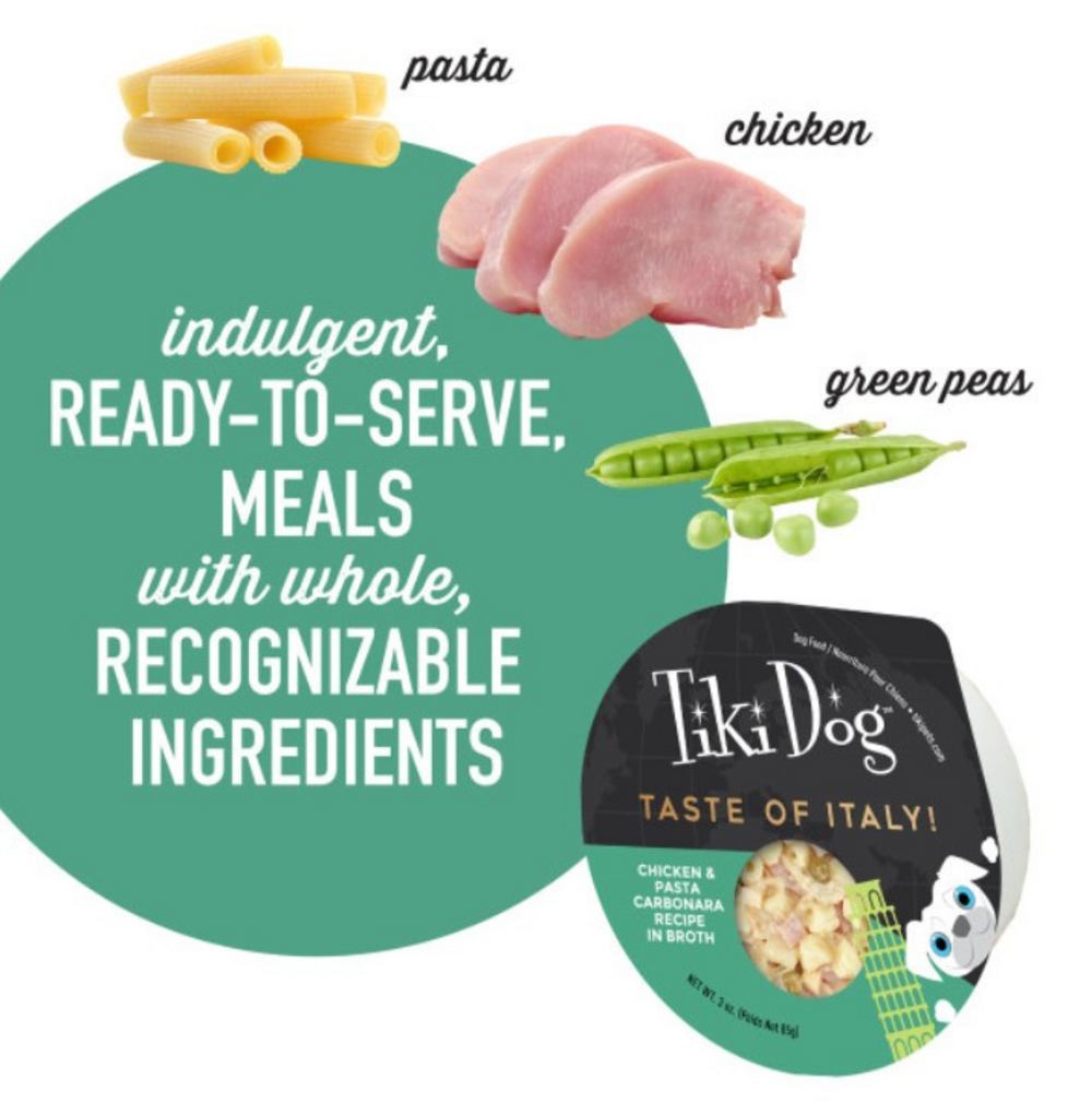 Treat your pup to a gourmet international experience with Tiki Dog Italian Carbonara a hearty meal with bacon eggs and peas in a rich creamy sauce served over pasta for a true mealtime indulgence.WET DOG FOOD – Made with real Chicken and other high-quality ingredients, and your pup will look forward to meal time.RECIPE DESIGNED FOR ADULT MAINTENANCE –Tiki Dog Taste of the World is formulated to meet the nutritional levels established by the AAFCO Dog Food Nutrient Profiles for Adult Maintenance.HIGH PROTEIN & MOISTURE – Count on the broth to provide protein and supplemental moisture at each meal.