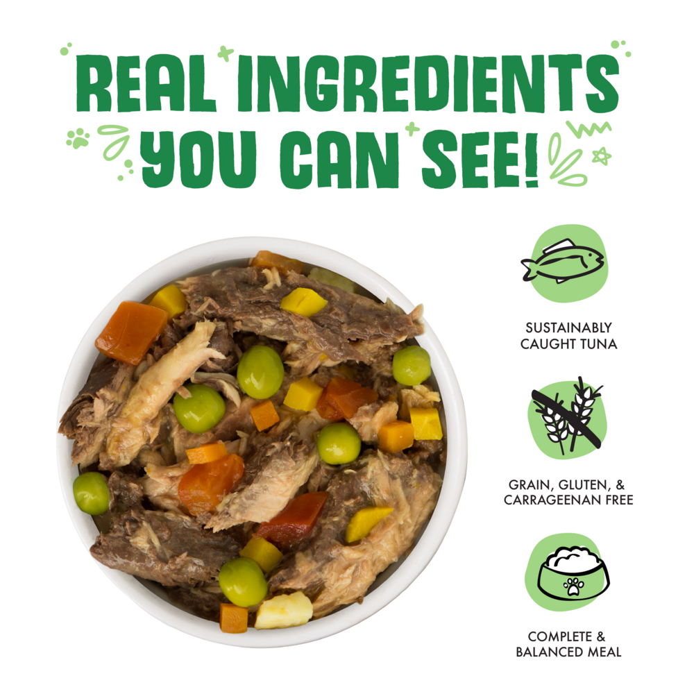 Tuna, Water Sufficient For Processing, Pumpkin, Pea, Carrot, Sweet Potato, Tomato, Potato Starch, Sunflower Seed Oil, Tricalcium Phosphate, Xanthan Gum, Choline Chloride, Vitamin E Supplement, Zinc Sulfate, Thiamine Mononitrate (Vitamin B1), Nicotinic Acid (Vitamin B3), Calcium Pantothenate, Vitamin A Supplement, Potassium Iodide, Manganese Sulfate, Copper Sulfate, Ferrous Sulfate, Riboflavin Supplement (Vitamin B2), Pyridoxine Hydrochloride (Vitamin B6), Vitamin D3 Supplement, Folic Acid, Vitamin B12 SupplementGuaranteed Analysis