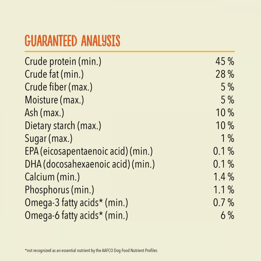 'Turkey with ground bone, turkey liver, whole herring, pumpkin, natural flavor, turkey heart,turkey bone broth, organic butternut squash, organic carrots, organic pear, salt, dried chicory root, turmeric, dried kelp, mixed tocopherols (preservative), vitamins (vitamin E supplement, niacin, thiamine mononitrate, riboflavin, calcium pantothenate, pyridoxine hydrochloride, folic acid, vitamin B12 supplement), minerals (zinc proteinate, copper proteinate), citric acid (preservative), rosemary extract'Guaranteed Analysis
