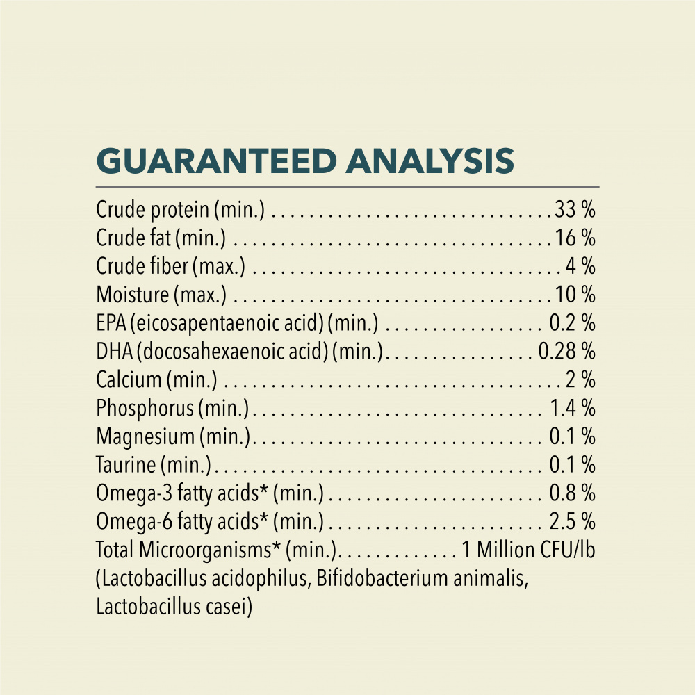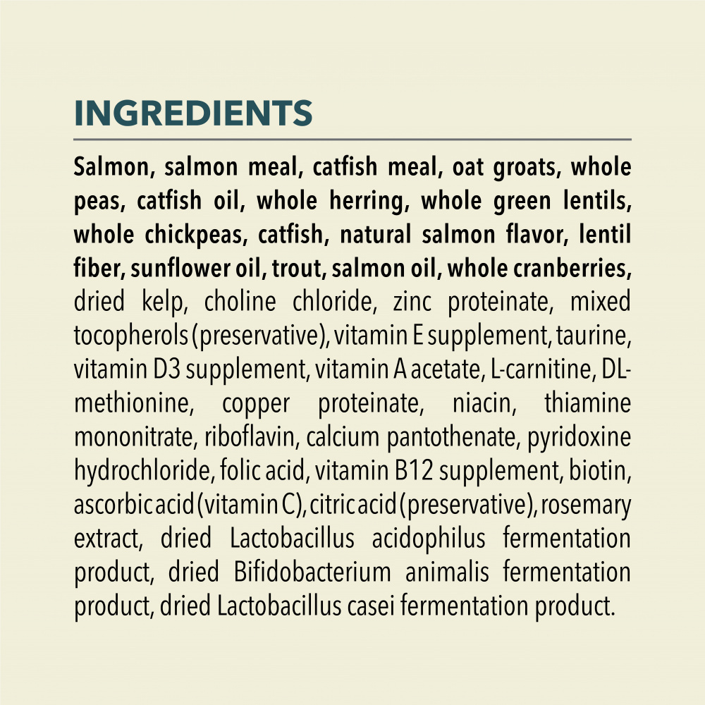 Salmon, salmon meal, catfish meal, oat groats, whole peas, catfish oil, whole herring, whole green lentils, whole chickpeas, catfish, natural salmon flavor, lentil fiber, sunflower oil, rainbow trout, salmon oil, whole cranberries, dried kelp, choline chloride, zinc proteinate, mixed tocopherols (preservative), vitamin E supplement, taurine, vitamin D3 supplement, vitamin A acetate, L-carnitine, DL-methionine, copper proteinate, niacin, thiamine mononitrate, riboflavin, calcium pantothenate, pyridoxine hydrochloride, folic acid, vitamin B12 supplement, biotin, ascorbic acid (vitamin C), citric acid (preservative), rosemary extract, dried Lactobacillus acidophilusfermentation product, dried Bifidobacterium animalisfermentation product, dried Lactobacillus caseifermentation product.Guaranteed Analysis