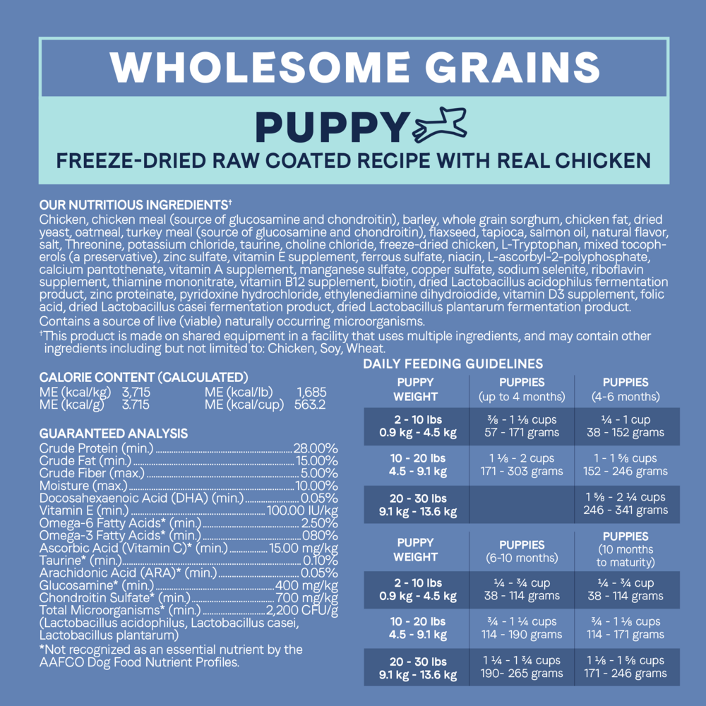 Chicken, chicken meal (source of glucosamine and chondroitin), barley, whole grain sorghum, chicken fat, dried yeast, oatmeal, turkey meal (source of glucosamine and chondroitin), flaxseed, tapioca, salmon oil, natural flavor, salt, Threonine, potassium chloride, taurine, choline chloride, freeze-dried chicken, Tryptophan, mixed tocopherols (a preservative), zinc sulfate, Vitamin E Supplement, ferrous sulfate, niacin, L-ascorbyl-2-polyshosphate, calcium pantothenate, vitamin A supplement, manganese sulfate, copper sulfate, sodium selenite, riboflavin supplement, thiamine mononitrate, vitamin B12 supplement, biotin, zinc proteinate, pyridoxine hydrochloride, ethylenediamine dihydroiodide, vitamin D3 supplement, folic acid, dried Bacillus coagulans fermentation product.