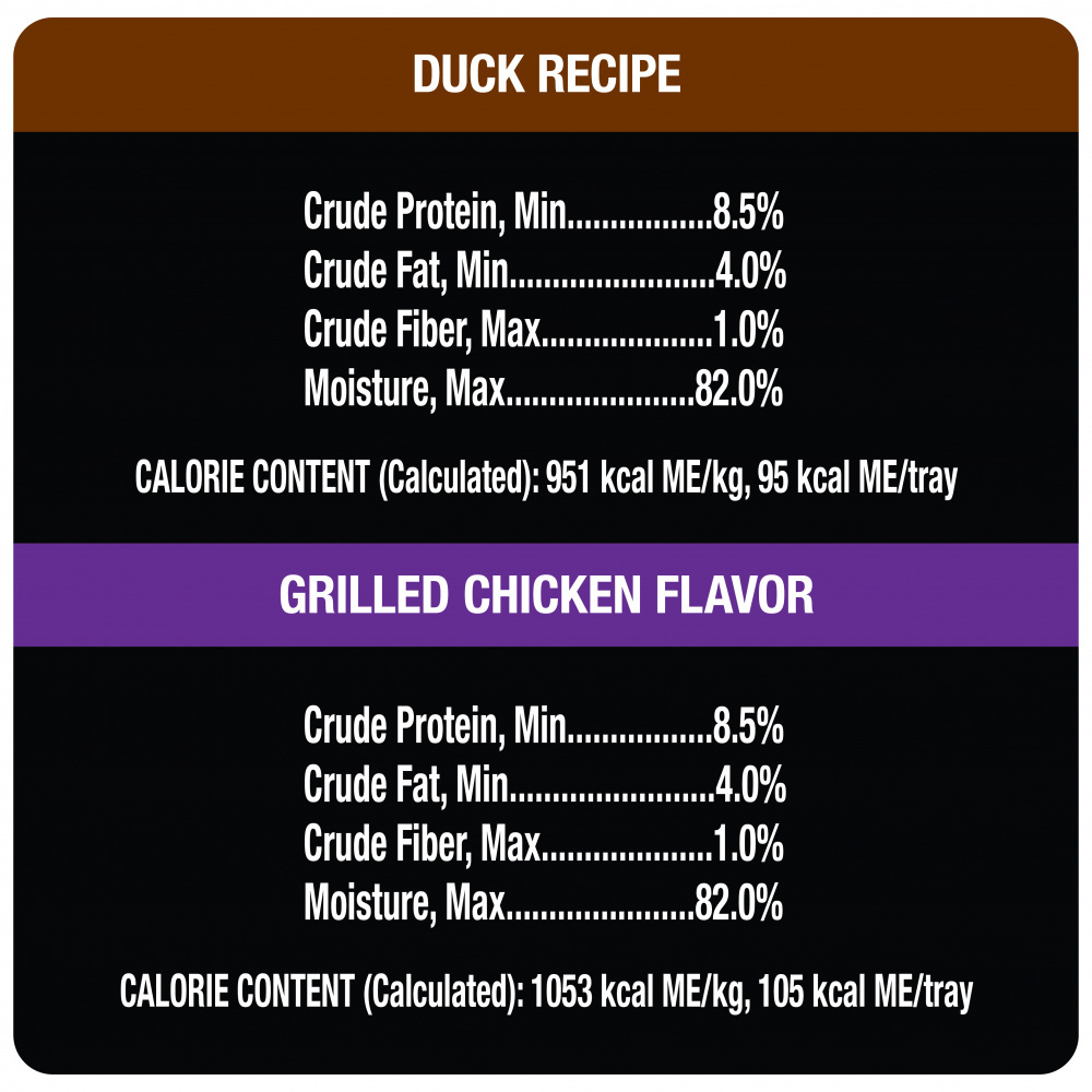 Duck Recipe: Duck, Chicken Liver, Beef Lung, Chicken Broth, Water, Pork By-Products, Chicken Heart, Calcium Carbonate, Sodium Tripolyphosphate, Carrageenan, Potassium Chloride, Xanthan Gum, Magnesium Proteinate, Dried Yam, Added Color, DL-Methionine, Salt, Erythorbic Acid (Preservative), Natural Flavor, Guar Gum, Zinc Sulfate, Vitamin E Supplement, Monocalcium Phosphate, Sodium Nitrite (For Color Retention), Copper Sulfate, Thiamine Mononitrate (Vitamin B1), D-Calcium Pantothenate, Vitamin D3 Supplement, Potassium Iodide"