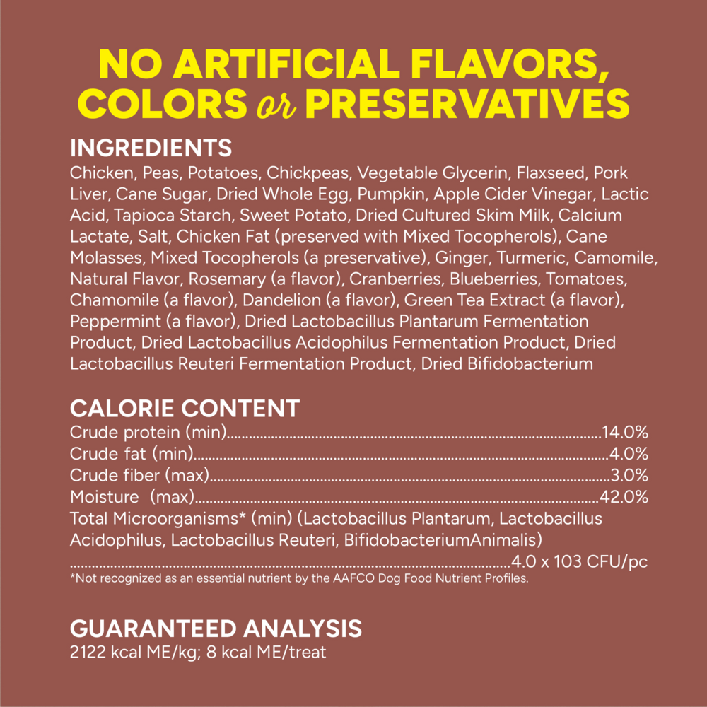 Chickpea flour, potato flour, pumpkin, tapioca starch, maple syrup, vegetable glycerine, natural flavor, salt, phosphoric acid, ginger, sorbic acid (as preservative), peppermint, chamomile, lavender, yeast culture, dried Enterococcus faecium fermentation product, dried Lactobacillus acidophilus fermentation product, dried Aspergillus niger fermentation extract, dried Trichoderma longibrachiatum fermentation extract, dried Bacillus subtilis fermentation extract, citric acid (as preservative), mixed tocopherols (as preservative), rosemary.