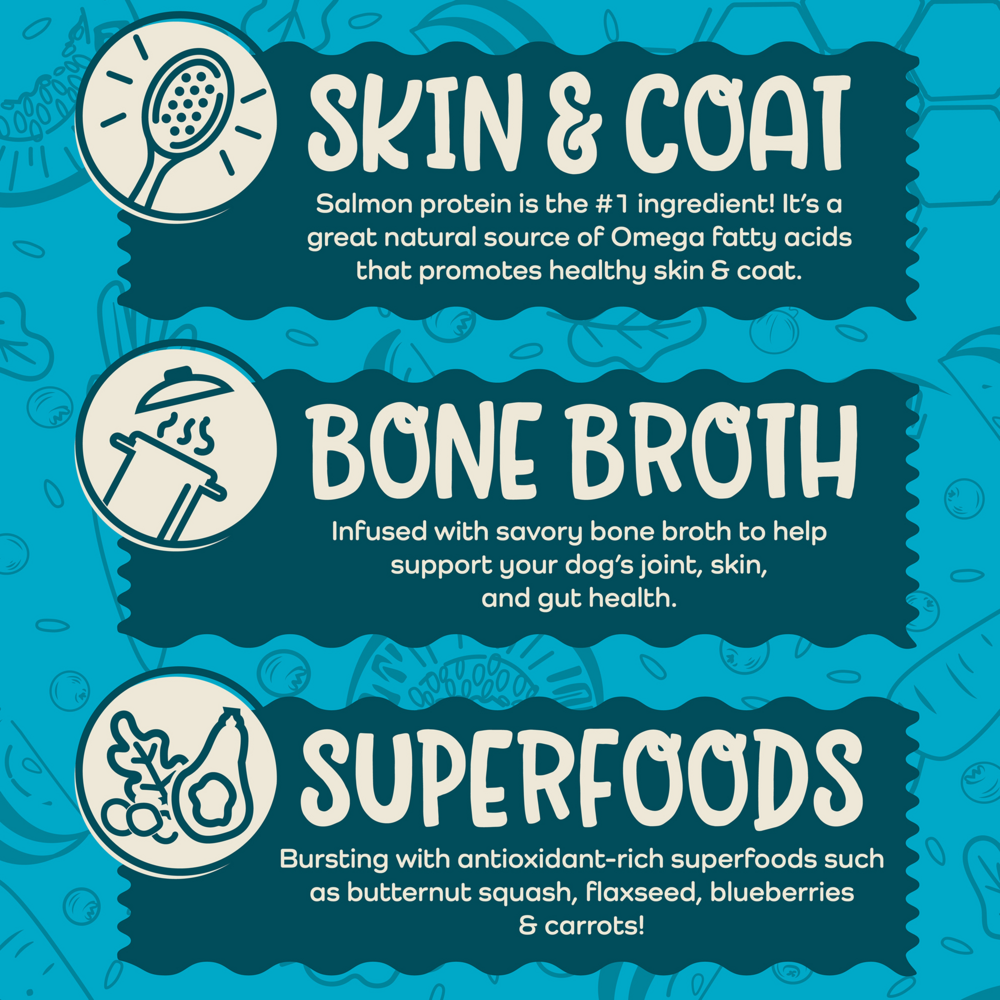 These soft and chewy salmon dog treats are the best way to add delicious to your dog’s day. Each grain-free bite is bursting with antioxidant-rich superfoods. The delicious salmon protein provides Omega-6 and Omega-3 fatty acids that may help their skin & coat.Bursting with antioxidant-rich superfoods such as apples and carrots. Infused with savory bone broth to support your dog’s gut, joints & skin. Grain-free, gluten-free treats made in USA kitchens.