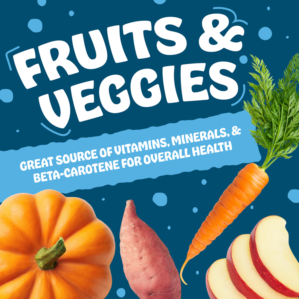 Fish Broth, Fish, Dried Egg Product, Pea Protein, Tapioca, Sunflower Oil, Salt, Duck, Sweet Potatoes, Carrots, Pumpkins, Green Peas, Apples, Natural Flavors, Guar Gum, Potassium Chloride, Calcium Sulfate, Choline Chloride, Vitamin E Supplement, Ferrous Sulfate, Zinc Oxide, Vitamin B12 Supplement, Copper Proteinate, Vitamin A Supplement, Manganese Proteinate, Niacin, Calcium Pantothenate, Thiamine Mononitrate, Sodium Selenite, Biotin, Riboflavin Supplement, Pyridoxine Hydrochloride, Potassium Iodide, Vitamin D3 Supplement, Beta-Carotene, Folic Acid.Guaranteed Analysis