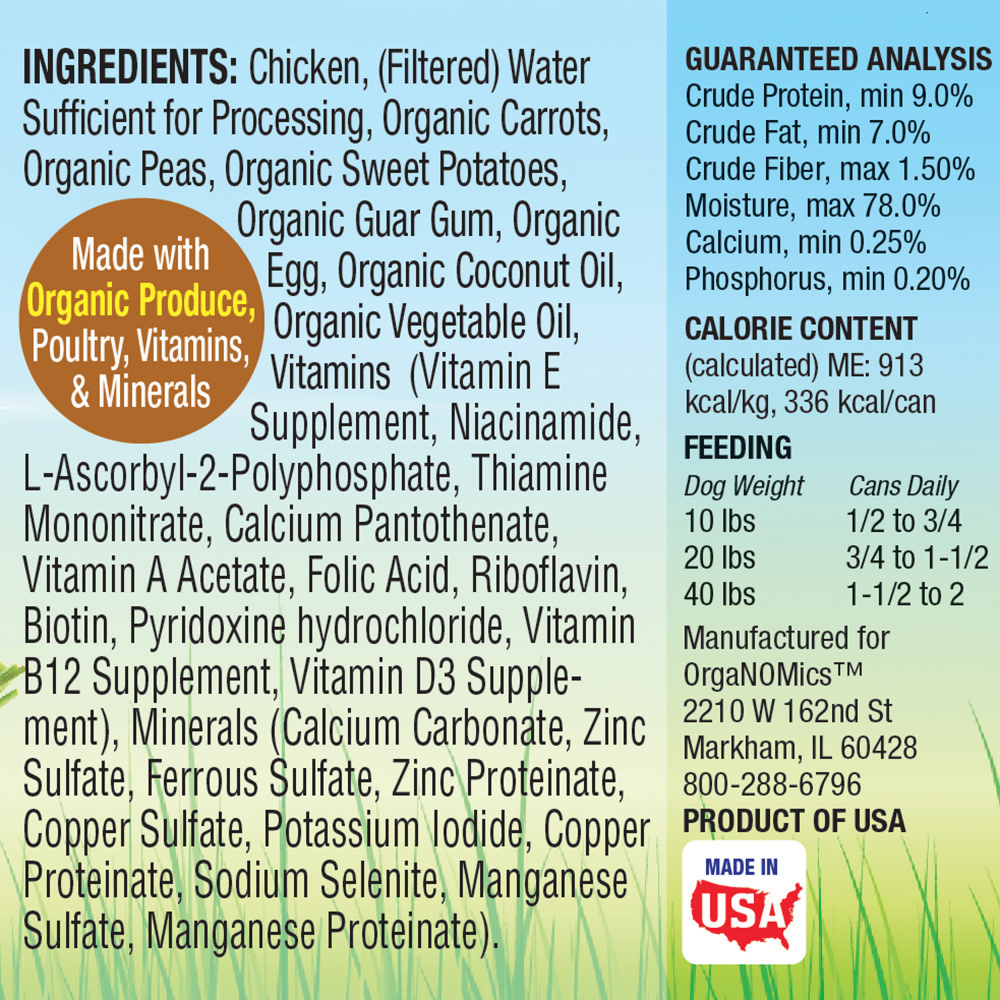 Chicken, Organic Carrots, Organic Peas, Organic Sweet Potatoes, Organic Guar Gum, Organic Egg, Organic Coconut Oil, Organic Vegetable Oil, Vitamins (Vitamin E Supplement, Niacinamide, L-Ascorbyl-2-Polyphosphate, Thiamine Mononitrate, Calcium Pantothenate, Vitamin A Acetate, Folic Acid, Riboflavin, Biotin, Pyridoxine hydrochloride, Vitamin B12 Supplement, Vitamin D3 Supplement), Minerals (Calcium Carbonate, Zinc Sulfate, Ferrous Sulfate, Zinc Proteinate, Copper Sulfate, Potassium Iodide, Copper Proteinate, Manganese Sulfate, Manganese Proteinate).Guaranteed Analysis