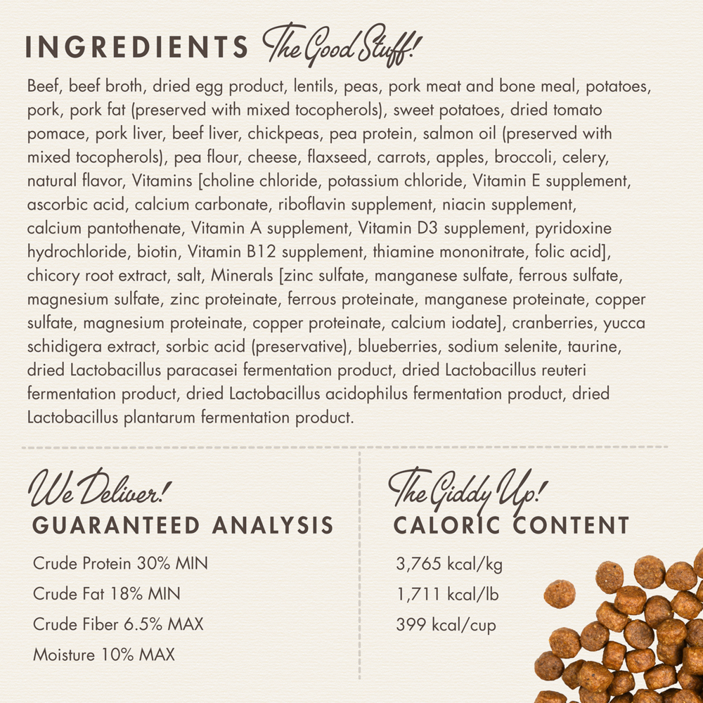 Beef, beef broth, dried egg product, lentils, peas, pork meat and bone meal, potatoes, pork, pork fat (preserved with mixed tocopherols), sweet potatoes, dried tomato pomace, pork liver, beef liver, chickpeas, pea protein, salmon oil (preserved with mixed tocopherols), pea flour, cheese, flaxseed, carrots, apples, broccoli, celery, natural flavor, Vitamins [choline chloride, potassium chloride, Vitamin E supplement, ascorbic acid, calcium carbonate, riboflavin supplement, niacin supplement, calcium pantothenate, Vitamin A supplement, Vitamin D3 supplement, pyridoxine hydrochloride, biotin, Vitamin B12 supplement, thiamine mononitrate, folic acid], chicory root extract, salt, Minerals [zinc sulfate, manganese sulfate, ferrous sulfate, magnesium sulfate, zinc proteinate, ferrous proteinate, manganese proteinate, copper sulfate, magnesium proteinate, copper proteinate, calcium iodate], cranberries, yucca schidigera extract, sorbic acid (preservative), blueberries, sodium selenite, taurine, dried Lactobacillus paracasei fermentation product, dried Lactobacillus reuteri fermentation product, dried Lactobacillus acidophilus fermentation product, dried Lactobacillus plantarum fermentation product