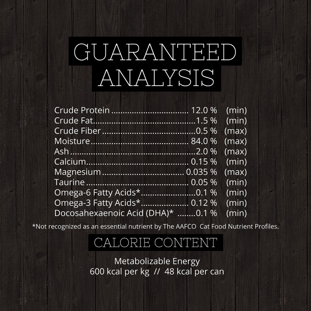 Tuna, Water Sufficient For Processing, Salmon, Sunflower Seed Oil, Tricalcium Phosphate, Locust Bean Gum, Carrageenan, Guar Gum, Potassium Chloride, Choline Chloride, Fructooligosaccharide, Taurine, Zinc Sulfate, Vitamin E Supplement, Ferrous Sulfate, Thiamine Mononitrate (Source of Vitamin B1), Nicotinic Acid (Source of Vitamin B3), Calcium Pantothenate, Vitamin A Supplement, Potassium Iodide, Manganese Sulfate, Copper Sulfate, Vitamin D3 Supplement, Riboflavin Supplement (Source of Vitamin B2), Pyridoxine Hydrochloride (Source of Vitamin B6), Folic Acid, Menadione Sodium Bisulfite Complex, Vitamin B12 Supplement.Guaranteed Analysis