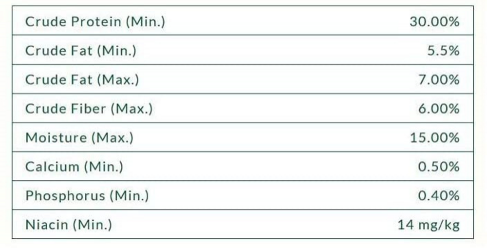 | Crude Protein | 30.0% min |