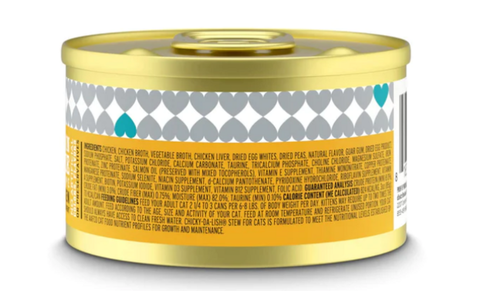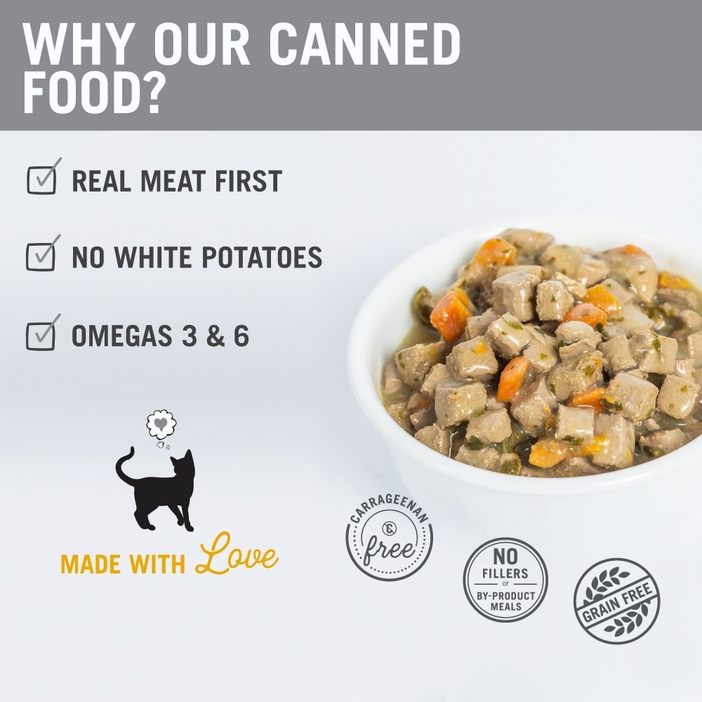 'This tasty pack of canned wet food is made for the cat who craves delicious and savory, chicken-packed stew! Each can serves up a boatload of protein and amino acids to keep your cat’s energy up. The moment you open a can, the smell of chicken stew will coax even the most introverted cats outta hiding. Our stew comes in many protein-packed flavors your cat will go nuts for. FRIENDLY PSA: This product is complete & balanced, I.E. Unlike some other brands—we didn’t cut any nutritional corners. So, each serving has the proper amount of vitamins and minerals for your growing kitten, adult or senior cat, according to our friends at AAFCO.