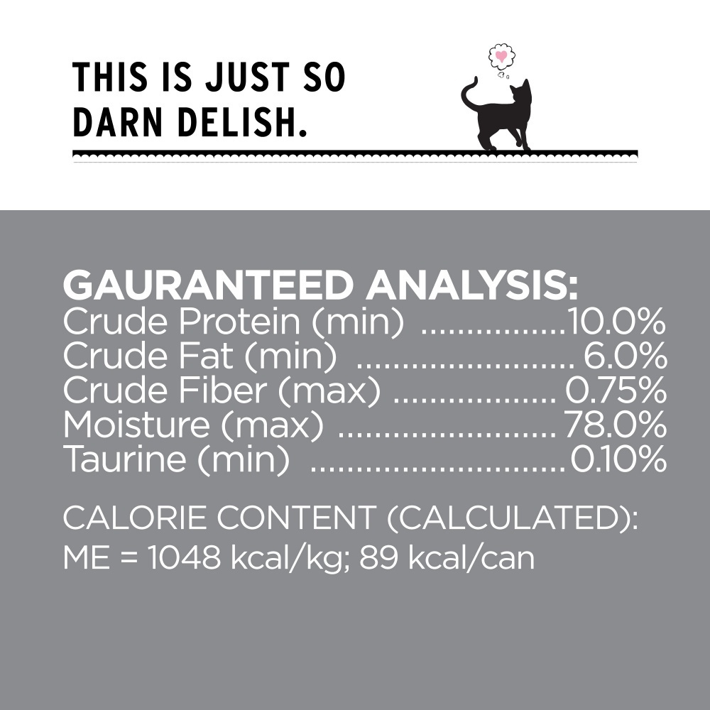 SALMON, CHICKEN, SALMON BROTH, CHICKEN LIVER, NATURAL FLAVOR, GUAR GUM, SALT, POTASSIUM CHLORIDE, TAURINE, DL-METHIONINE, CASSIA GUM, XANTHAN GUM, CHOLINE CHLORIDE, MAGNESIUM SULFATE, IRON PROTEINATE, ZINC PROTEINATE, THIAMINE MONONITRATE, VITAMIN E SUPPLEMENT, COPPER PROTEINATE, MANGANESE PROTEINATE, SODIUM SELENITE, NIACIN SUPPLEMENT, d-CALCIUM PANTOTHENATE, PYRIDOXINE HYDROCHLORIDE, RIBOFLAVIN SUPPLEMENT, VITAMIN A SUPPLEMENT, BIOTIN, POTASSIUM IODIDE, VITAMIN D3 SUPPLEMENT, VITAMIN B12 SUPPLEMENT, FOLIC ACID.Guaranteed Analysis