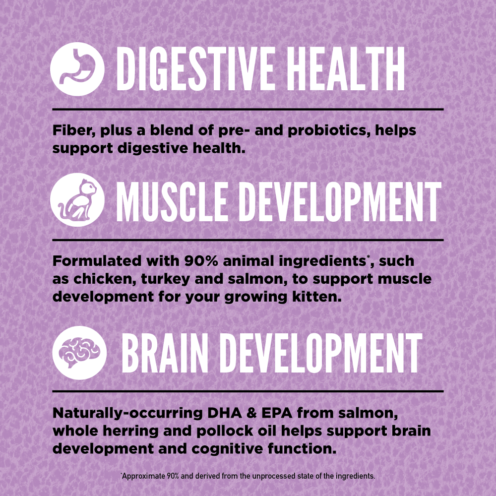 - Packed with 90 percent animal ingredients*, this high protein cat food contains the most succulent and nourishing parts of the prey to help your growing kitten thrive