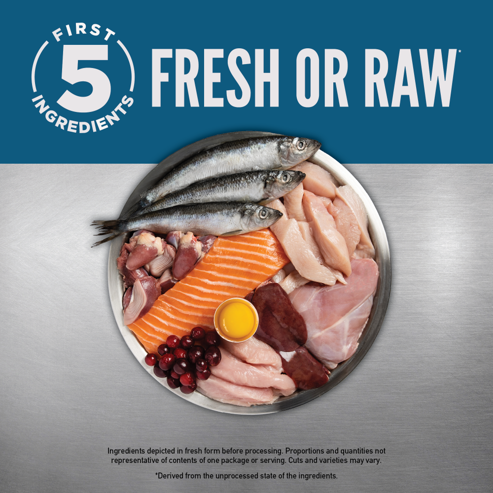 Chicken, salmon, turkey, whole herring, chicken liver, dehydrated chicken, dehydrated turkey, dehydrated sardine, dehydrated chicken liver, dehydrated egg, whole red lentils, whole pinto beans, turkey giblets (liver, heart, gizzard), eggs, rabbit, pollock oil, whole green lentils, whole navy beans, whole chickpeas, whole peas, ground miscanthus grass, natural chicken flavor, chicken fat, chicken hearts, whole cranberries, choline chloride, dried kelp, mixed tocopherols (preservative), whole pumpkin, whole butternut squash, collard greens, whole apples, whole pears, zinc proteinate, vitamin E supplement, dried chicory root, hydrolyzed yeast, dried brewers yeast, thiamine mononitrate, riboflavin, niacin, calcium pantothenate, pyridoxine hydrochloride, folic acid, vitamin B12 supplement, copper proteinate, dried Bacillus coagulans fermentation product, turmeric, sarsaparilla root, althea root, rosehips, juniper berries, citric acid (preservative), rosemary extract. Crude protein 40% min, Crude fat 18% min, Crude fiber 4% max, Moisture 10% max, Arginine 2.3% min, DHA (docosahexaenoic acid) 0.35% min, EPA (eicosapentaenoic acid) 0.35% min, Calcium 1.4% min, Phosphorus 1.1% min, Magnesium 0.1% min, Vitamin A 25,000 IU/kg min, Taurine 0.1% min, Omega-6 fatty acids* 3.0% min, Omega-3 fatty acids* 1.2% min, Total Microorganisms* 100 Million CFU/lb, (Bacillus coagulans), *Not recognized as an essential nutrient by the AAFCO Dog Food Nutrient Profiles.Guaranteed Analysis
