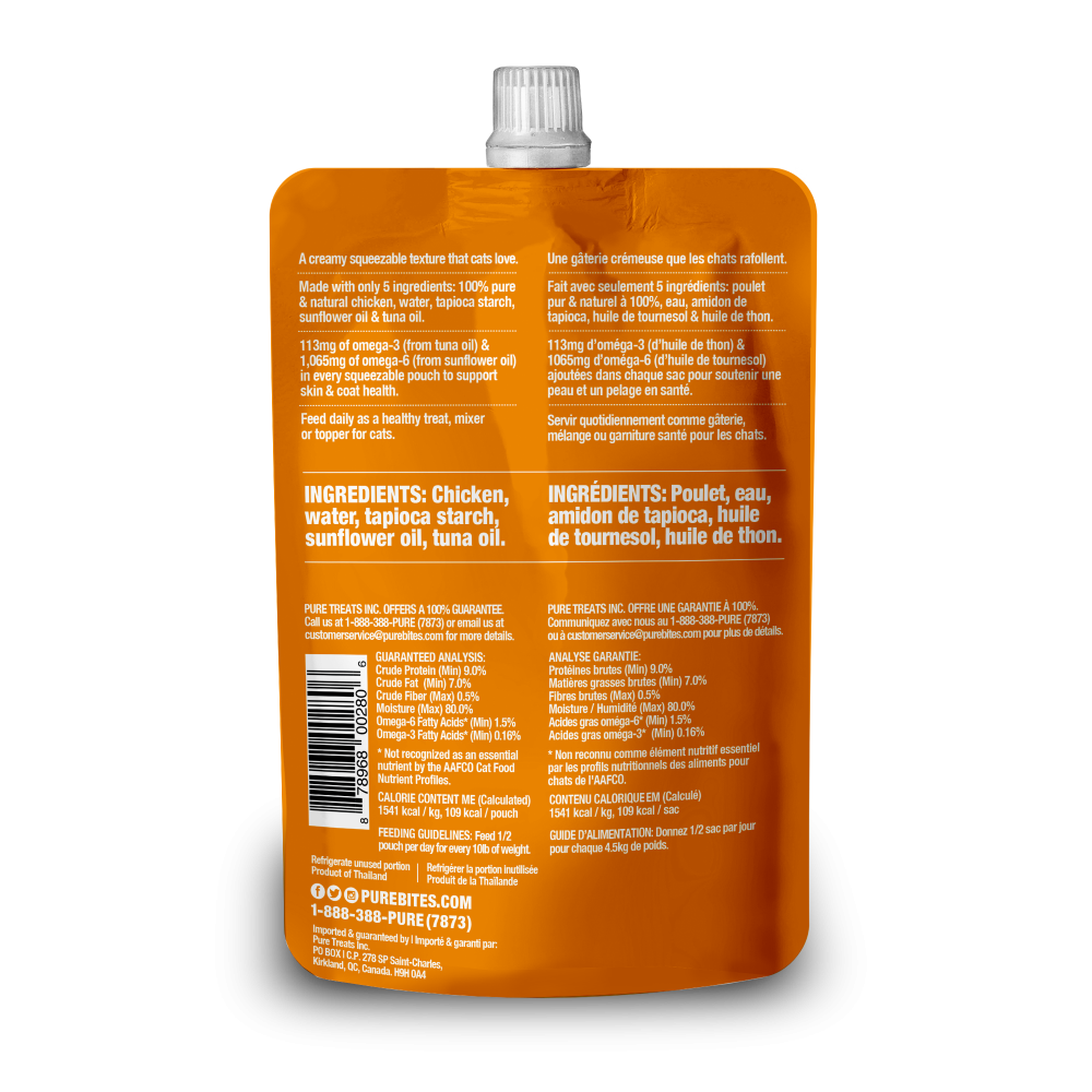 At PureBites, we?re always asking pet parents to ?Go ahead, look at our ingredients?. PureBites+ Squeezables Skin & Coat formula is made with only 5 simple human grade ingredients you can read, pronounce, and trust: 100% pure chicken, water, tapioca starch, sunflower oil, & tuna oil. No artificial colors, fillers, or sweeteners. PureBites+ Skin & Coat formula has 113mg of omega-3 and 1065mg of omega-6 added to every squeezable pouch to support daily skin & coat health. We make our treats fresh & pure in a creamy texture and in a fun and interactive squeezable pouch, locking in the taste cats crave and superior nutrition that pet parents love.