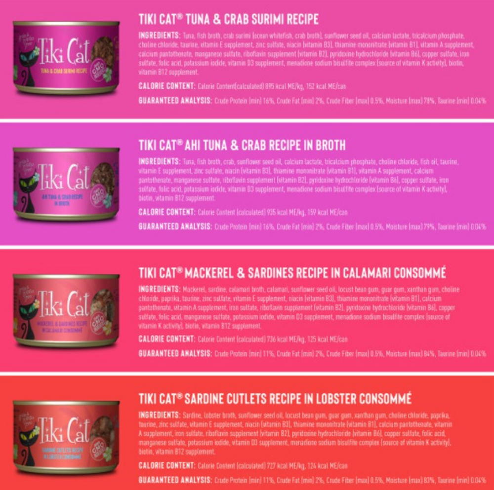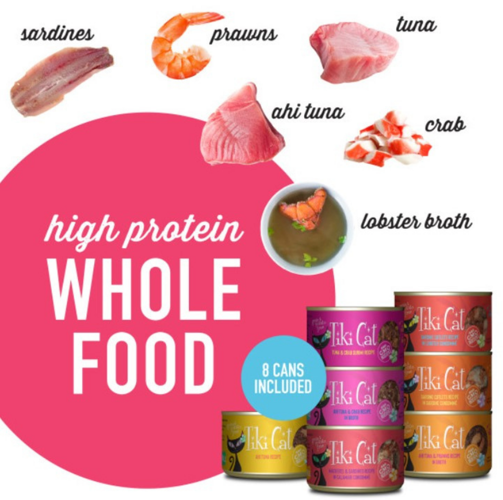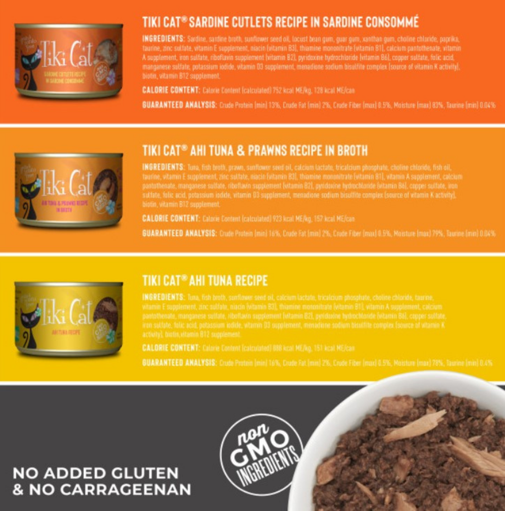 Tiki Cat Grill Wet Cat Food is indulgent flaked fish recipes, garnished with shellfish, like whole prawns, in a delicate consomme. Grain free wet food – rely on the delicious blend in Tiki cat grill to provide complete and balanced nutrition for your cat in any life stage.High moisture wet cat Food – count on the high moisture Content of each can of cat grill to give your cat the supplemental water she needs.Nutrient rich cat food - giving your cat the Nutrition she needs and the taste she loves.