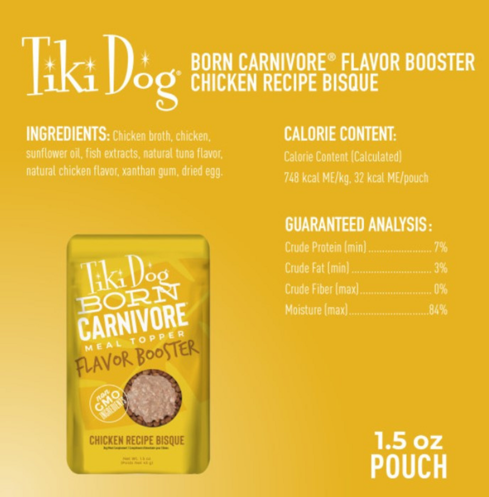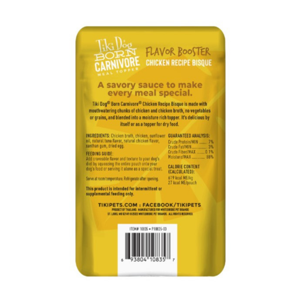 Tiki DogBorn Carnivore Flavor Booster Bisque is a decadent gravy with small chunks of chicken tuna beef or pork for a luxurious meal topper or treat. GRAIN FREE – Indulge your dog with this delicious and grain free addition to their diet. DOG FOOD FLAVOR BOOSTER – Serve over dry food for an added boost of flavor or as an indulgent treat.