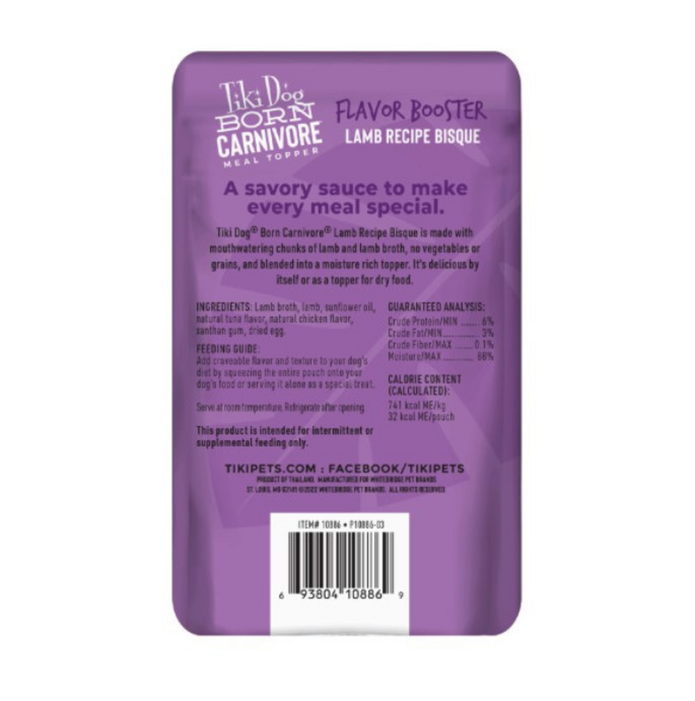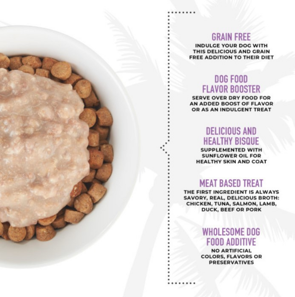 Tiki Dog® Born Carnivore Flavor Booster Bisque is a decadent gravy with small chunks of chicken, tuna, beef or pork, for a luxurious meal topper or treat. GRAIN FREE – Indulge your dog with this delicious and grain free addition to their diet. DOG FOOD FLAVOR BOOSTER – Serve over dry food for an added boost of flavor or as an indulgent treat. DELICIOUS AND HEALTHY BISQUE – Supplemented with sunflower oil for healthy skin and coat.