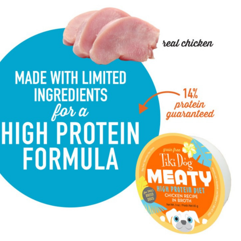 Tiki DogMeaty Chicken Recipe in Broth focuses on protein. You wo not find any grain or added carbohydrates in these shredded meat cups.