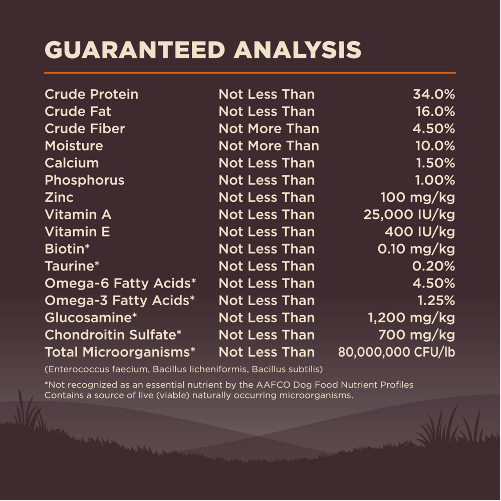 Deboned Turkey, Chicken Meal (source of Chondroitin Sulfate), Turkey Meal (source of Glucosamine), Oatmeal, Barley, Chicken Fat, Tomato Pomace, Ground Flaxseed, Quinoa, Natural Turkey Flavor, Chicory Root Extract, Salmon Oil, Potassium Chloride, Choline Chloride, Taurine, Vitamin E Supplement, Spinach, Broccoli, Carrots, Parsley, Apples, Blueberries, Kale, Zinc Proteinate, Mixed Tocopherols added to preserve freshness, Zinc Sulfate, Calcium Carbonate, Niacin, Iron Proteinate, Ferrous Sulfate, Yucca Schidigera Extract, Vitamin A Supplement, Copper Sulfate, Thiamine Mononitrate, Copper Proteinate, Manganese Proteinate, Manganese Sulfate, d-Calcium Pantothenate, Sodium Selenite, Pyridoxine Hydrochloride, Riboflavin, Biotin, Vitamin D3 Supplement, Calcium Iodate, Vitamin B12 Supplement, Folic Acid, Ascorbic Acid (Vitamin C), Dried Lactobacillus plantarum Fermentation Product, Dried Enterococcus faecium Fermentation Product, Dried Lactobacillus casei Fermentation Product, Dried Lactobacillus acidophilus Fermentation Product, Rosemary Extract, Green Tea Extract, Spearmint Extract.Guaranteed Analysis