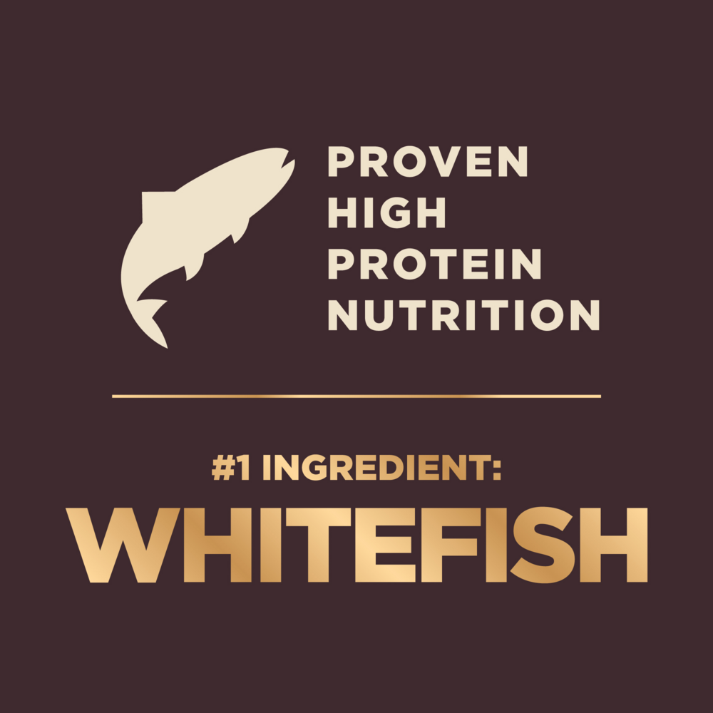 Whitefish, Herring Meal (source of Glucosamine ), Menhaden Fish Meal (source of Chondroitin Sulfate), Oatmeal, Barley, Canola Oil, Tomato Pomace, Ground Flaxseed, Quinoa, Potassium Chloride, Natural Fish Flavor, Chicory Root Extract, Choline Chloride, Vitamin E Supplement, Taurine, Spinach, Broccoli, Carrots, Parsley, Apples, Blueberries, Kale, Zinc Proteinate, Mixed Tocopherols added to preserve freshness, Zinc Sulfate, Calcium Carbonate, Niacin, Iron Proteinate, Ferrous Sulfate, Yucca Schidigera Extract, Vitamin A Supplement, Copper Sulfate, Thiamine Mononitrate, Copper Proteinate, Manganese Proteinate, Manganese Sulfate, d-Calcium Pantothenate, Sodium Selenite, Pyridoxine Hydrochloride, Riboflavin, Biotin, Vitamin D3 Supplement, Calcium Iodate, Vitamin B12 Supplement, Folic Acid, Ascorbic Acid (Vitamin C), Dried Lactobacillus plantarum Fermentation Product, Dried Enterococcus faecium Fermentation Product, Dried Lactobacillus casei Fermentation Product, Dried Lactobacillus acidophilus Fermentation Product, Rosemary Extract, Green Tea Extract, Spearmint Extract.Guaranteed Analysis